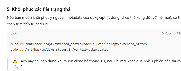 Nếu bạn muốn khôi phục y nguyên metadata của dpkg/apt (ít dùng, vì có thể xung đột với hệ mới), có thể chép trực tiếp từ backup: